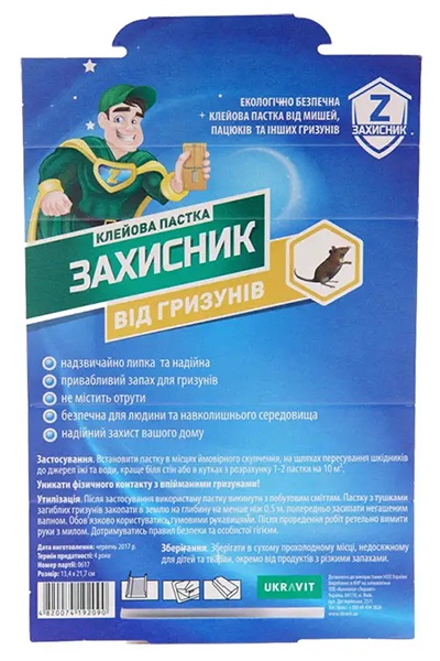 «Клейова пастка Захисник» для виявлення і вилову дрібних гризунів (всі види мишей) і комах - шкідників (таргани, мурахи, міль, мухи, комарі) в сухих приміщеннях усіх категорій. Клейова пастка має привабливий запах, нетоксична, не містить отруйних речовин.